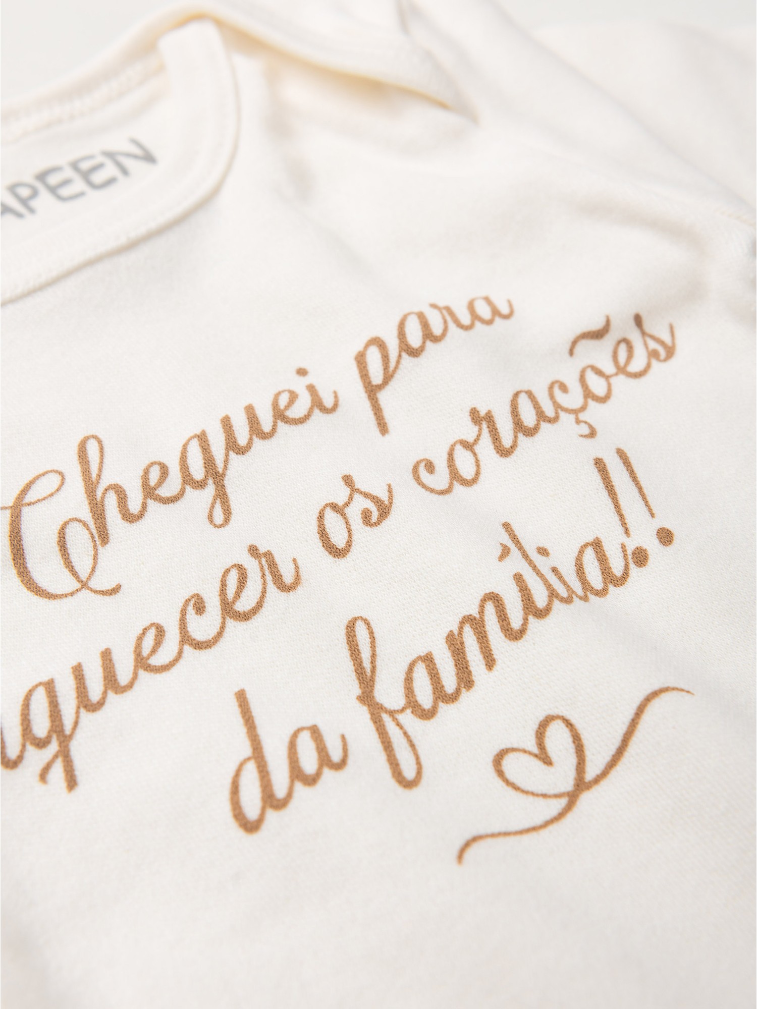 Body bebê cor off, confeccionado em tecido 100% algodão, garantindo maciez e conforto para a pele delicada do bebê. Possui estampa em silk de alta durabilidade com a frase carinhosa: "Cheguei para aquecer os corações da família", transmitindo amor e significado especial. Modelo clássico e versátil, ideal para presentear e eternizar momentos únicos em família.