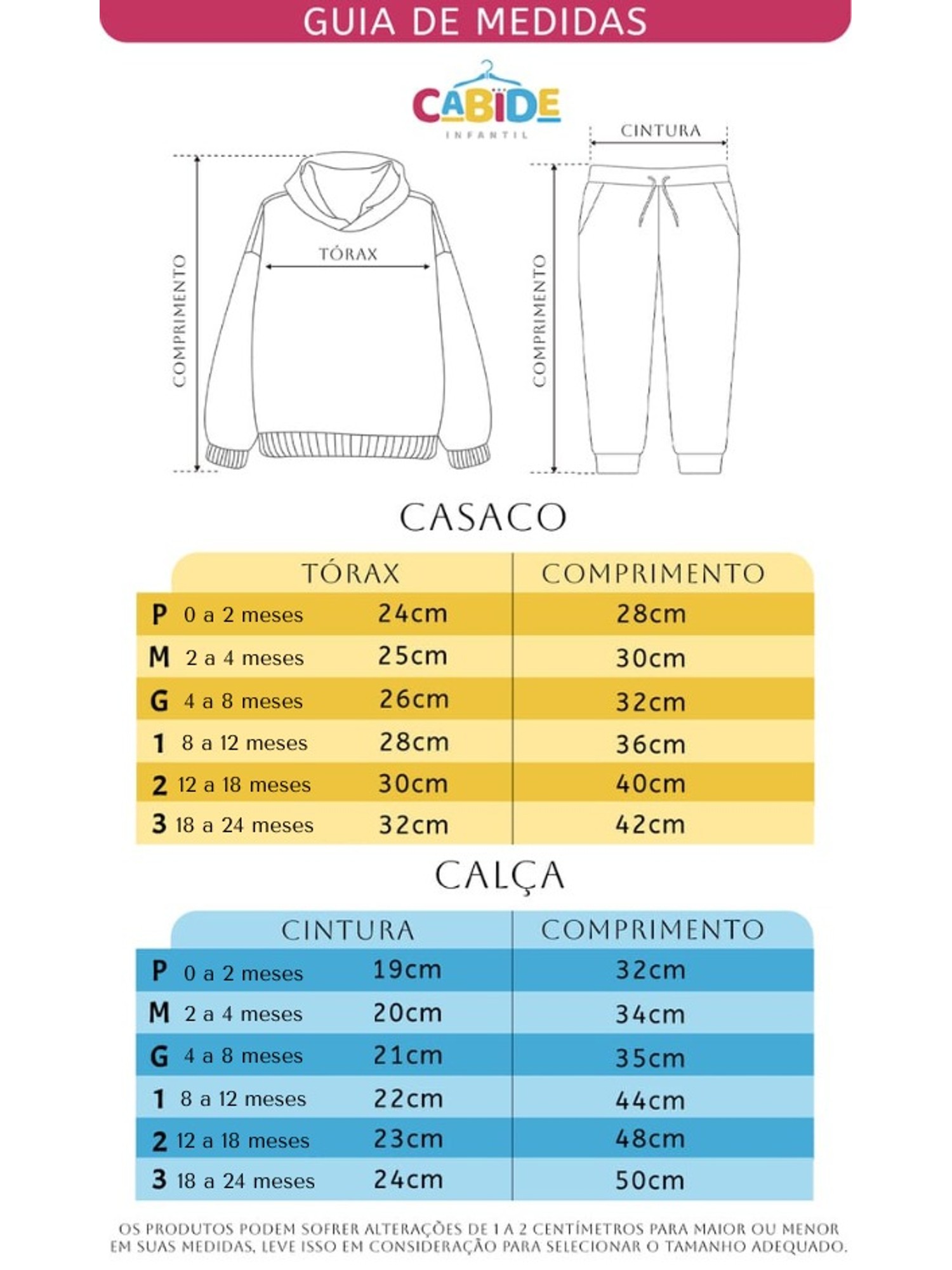 Os conjuntos podem variar de medidas até 2 cm após primeira lavagem.